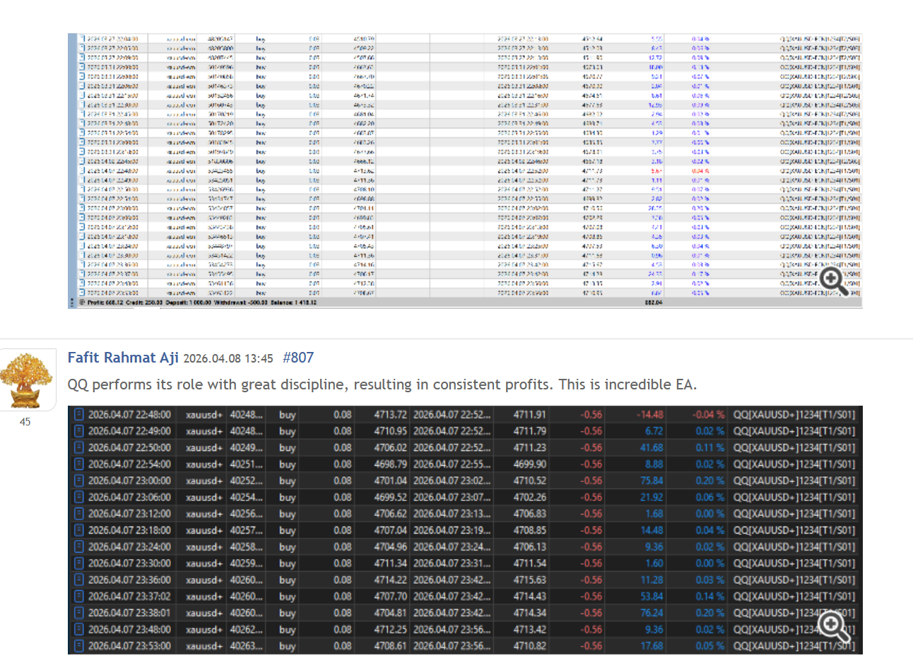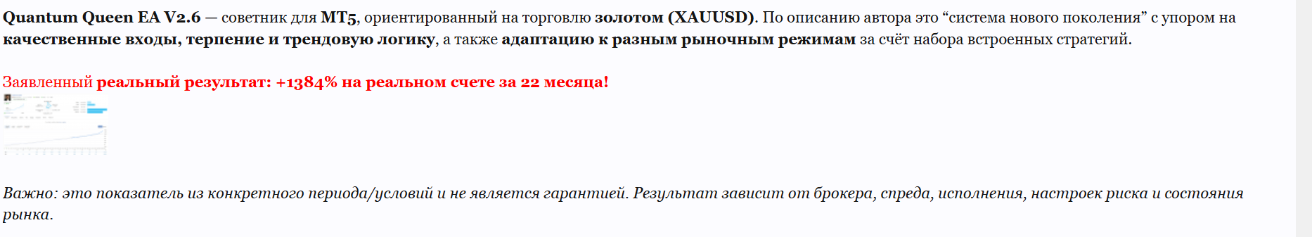 В сети начали появляться негативные отзывы о программе Quantum Queen MT5. Основная критика связана с тем, что советник работает только с золотом и использует дополнительные ордера при движении цены против начальной позиции в небольшом ценовом диапазоне. Такая проблема приводит к просадкам во время сильных трендов.
