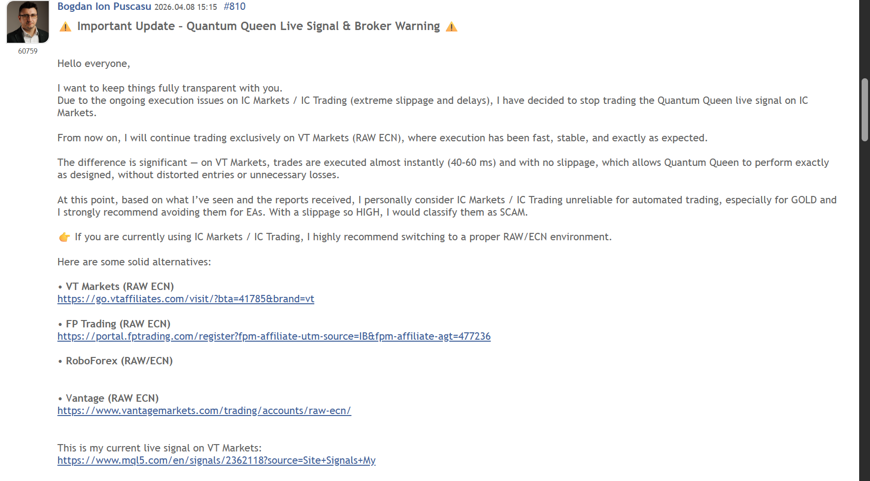 Еще одна проблема – сильная зависимость от того, как честно брокер исполняет ордера. Даже задержка в пару секунд или проскальзывание превращают прибыльную сделку в убыточную. Сам создатель стратегии признавал, что с исполнением у брокеров проблемы. В итоге он перешел на VT Markets и уже там продвигал свою партнерскую ссылку.