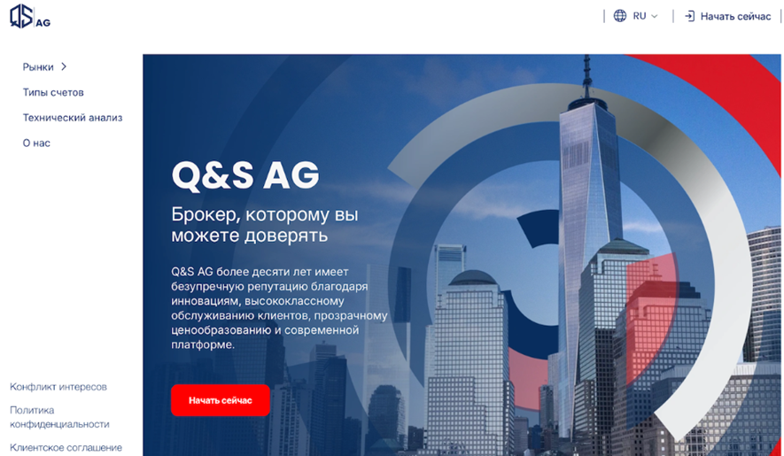 Брокерская компания Q&S AG работает на нескольких языках, в том числе на русском. Слева находится информационная панель, позволяющая узнать подробности об организации, рынках, типах счетов и техническом анализе. Как отмечено на сайте, компания является надежным поставщиком услуг. Указано, что в штате работают опытные специалисты. У представленного брокера есть награды. Но информация от учредителей ничем не подтверждена. На сайте загружено несколько регламентов, в том числе пользовательское соглашение и политика конфиденциальности.