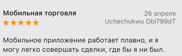Другой клиент заявляет, что приложение позволяет ему совершать сделки из любой точки мира. Впрочем, такую возможность дает практически любая биржа. Подобные комментарии являются неинформативными и легко могут оказаться «заказными».