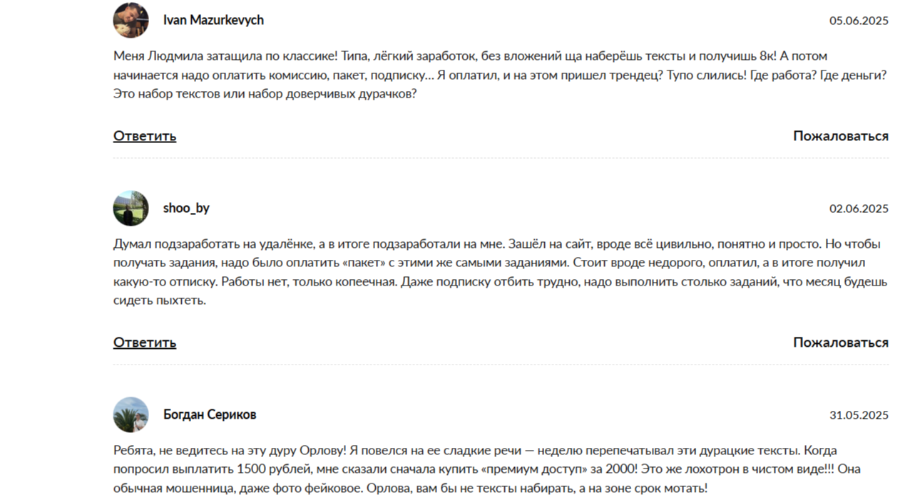 Очередной развод с обещаниями лёгкого заработка на текстах. Обещают до 300к в месяц, а по факту – пустышка. Никаких реальных заказов, только потеря времени и денег.
