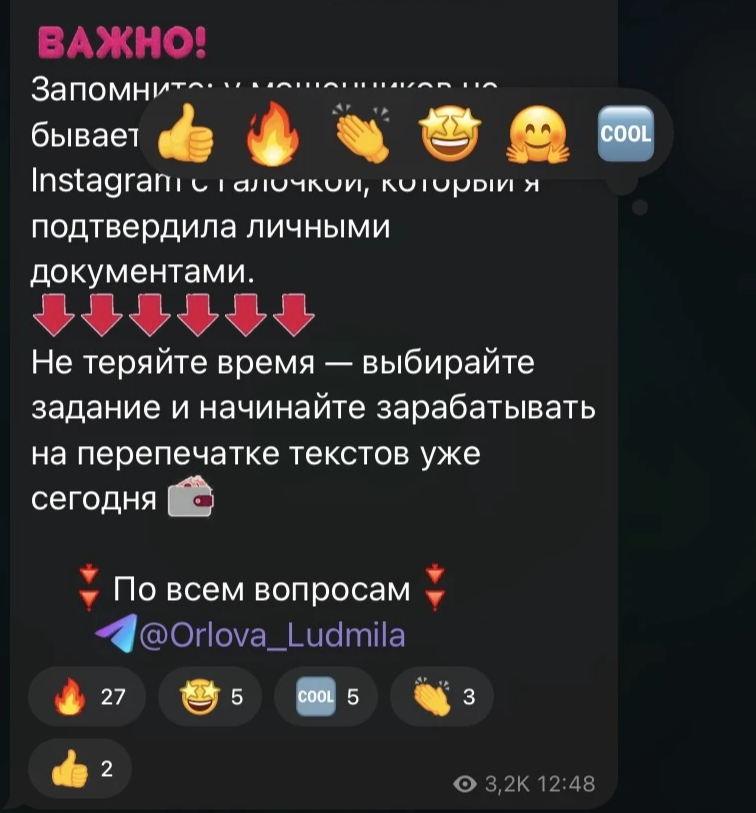Анализ деятельности телеграм-канала Rabota S Tekst и множество негативных отзывов подтвердили, что проект является обыкновенным скамом. Автор Людмила Орлова самая настоящая мошенница. На это указывают следующие признаки: