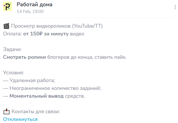 Канал не вызывает доверия из-за объявлений, которые на нем размещаются. Никакие реальные работодатели не предлагают просматривать видео на Ютубе за сотни рублей в минуту, подобные вакансии размещают только мошенники.