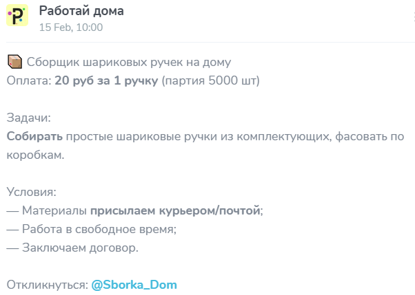 Вакансии чаще всего сводятся к простейшей работе с подозрительно высокой оплатой. Например, подписчикам предлагают просматривать видео на Ютубе за 150 рублей в минуту, отвечать на сообщения в чате или собирать шариковые ручки на дому.