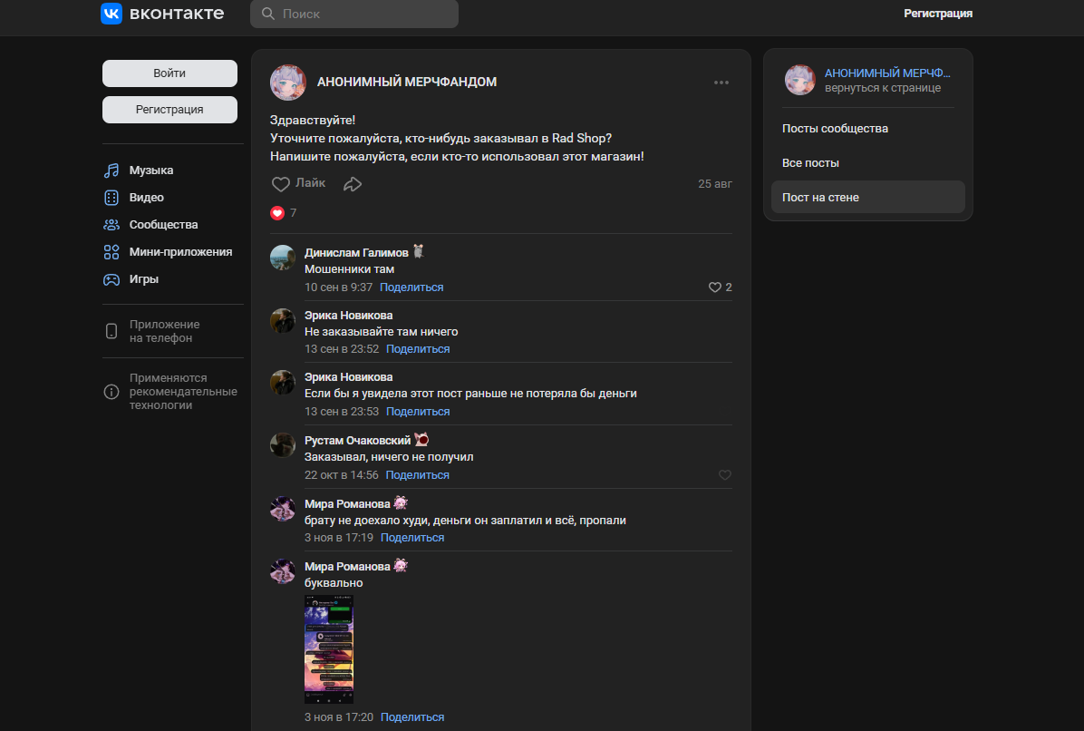 При этом у телеграмм-магазина RadShop отсутствует внешний механизм защиты сделки. Нет маркетплейса с программой безопасной оплаты, нет сервиса условного депонирования. Фактически клиенту приходится доверять чату и скриншотам чеков. Еще один сомнительный момент связан с одноразовыми сообществами: в прошлом появлялись блокировки групп Вк с похожим названием, что понижает уровень доверия.