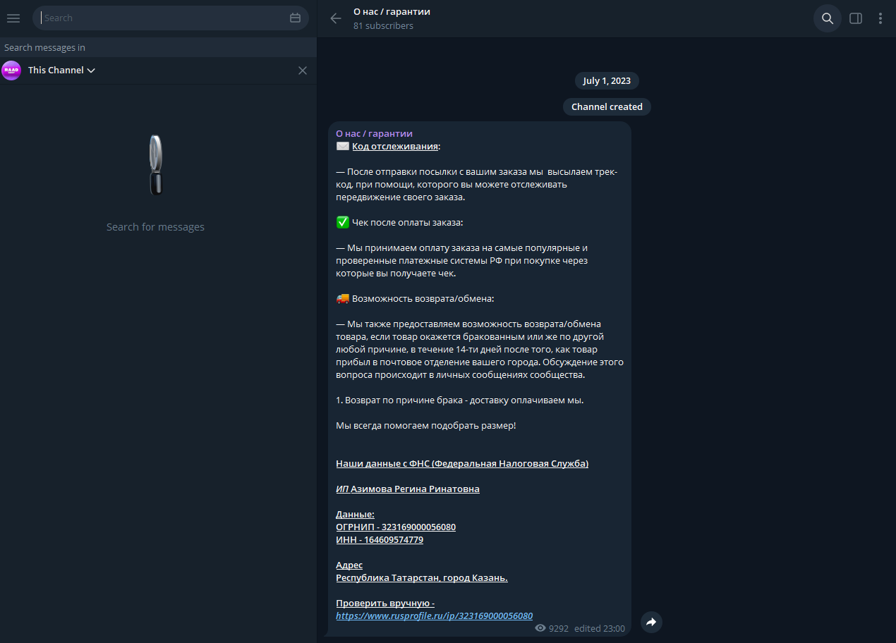 - Продажи ведутся исключительно через телеграмм-канал без сторонних площадок. Соответственно, клиент остается без защиты маркетплейса, а вернуть деньги получится только по согласию админа или через банк.
