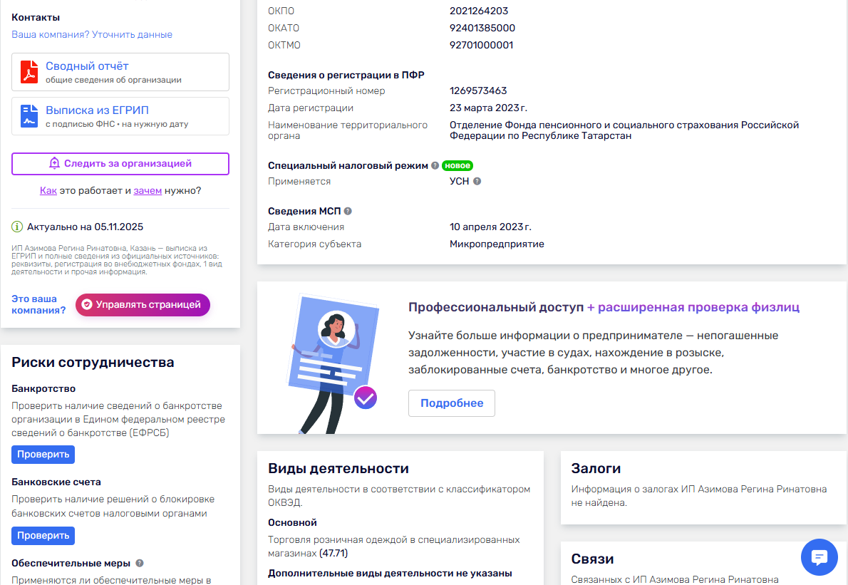 Телеграм-магазином Raad Shopp управляет ИП Азимова Регина Ринатовна, основной вид деятельности по ОГРНИП — розничная торговля одеждой в специализированных магазинах. На осень 2025 года канал «Рад Шоп» насчитывает свыше 11 000 подписчиков, активность средняя: публикации выходят почти каждый день, но количество просмотров около 1300, а реакции ставят лишь 50-80 участников. Для обратной связи и оформления покупок представлена аккаунт Manager Raad.