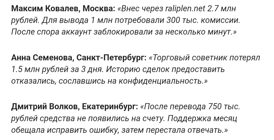 О Raliplen co отзывы негативные и говорят о мошенничестве. Так Максим Ковалев утверждает, что у него потребовали комиссию для вывода средств, а после отказа заплатить заблокировали аккаунт. Анна Семенова сообщает о том, что ее торговый советник потерял примерно полтора миллиона рублей за 3 дня.У Дмитрия Волкова средства и вовсе не появились на счету, и поддержка не решила эту проблему.