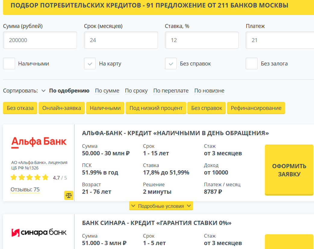 Пользоваться сайтом Online Rapida Ru очень легко. Посетитель должен ввести параметры необходимого кредита: сумму, срок, ставку и т. д. После этого «Рапида Онлайн» предложит ему подходящие варианты в действующих финансовых учреждениях. Например, 200 тыс. руб. на 2 года можно взять под 12% в Альфа-Банке, Синаре и других банковских учреждениях из списка.