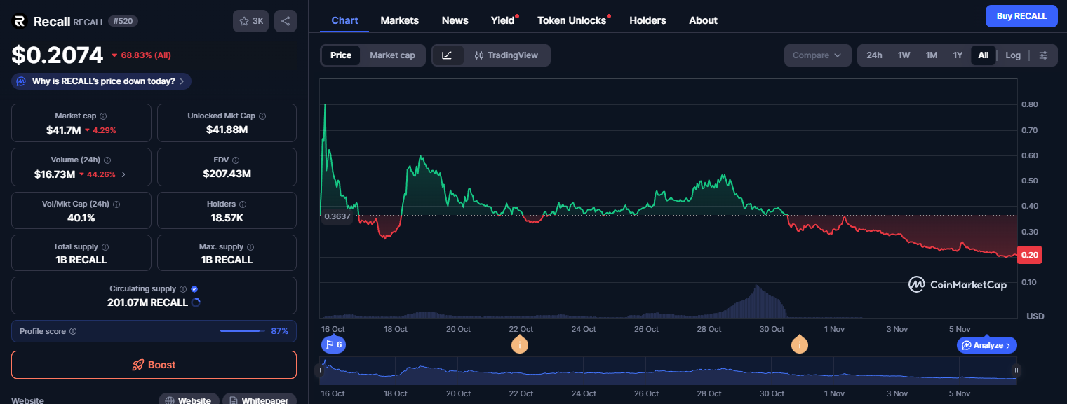 В ноябре 2025 года стоимость токена оценивается примерно в $0.23, в зависимости от выбранной площадки, но это значительно ниже исторического максимума в $0.61, который был зафиксирован в октябре. Можно судить о том, что после листинга Recall Token цена просела, но не слишком сильно, а это позволяет судить о некоторых перспективах.