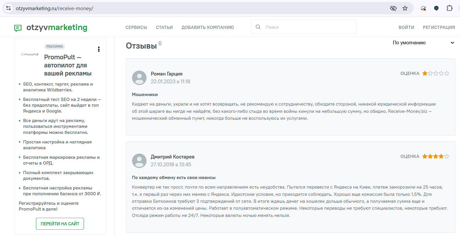 Отзывы о сайте Receive Money Top найти не удалось — ни положительных, ни отрицательных. Схожий по названию клон с biz после точки пытается сформировать положительное впечатление у потенциальных клиентов на сайте отзовике отзывмаркетинг ру путем размещения явно фейковых откликов.