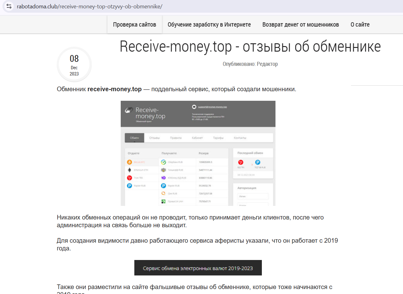 Сайт rabotadoma club описывает классический лохотрон: “обменник принимает платежи, но не выводит”.