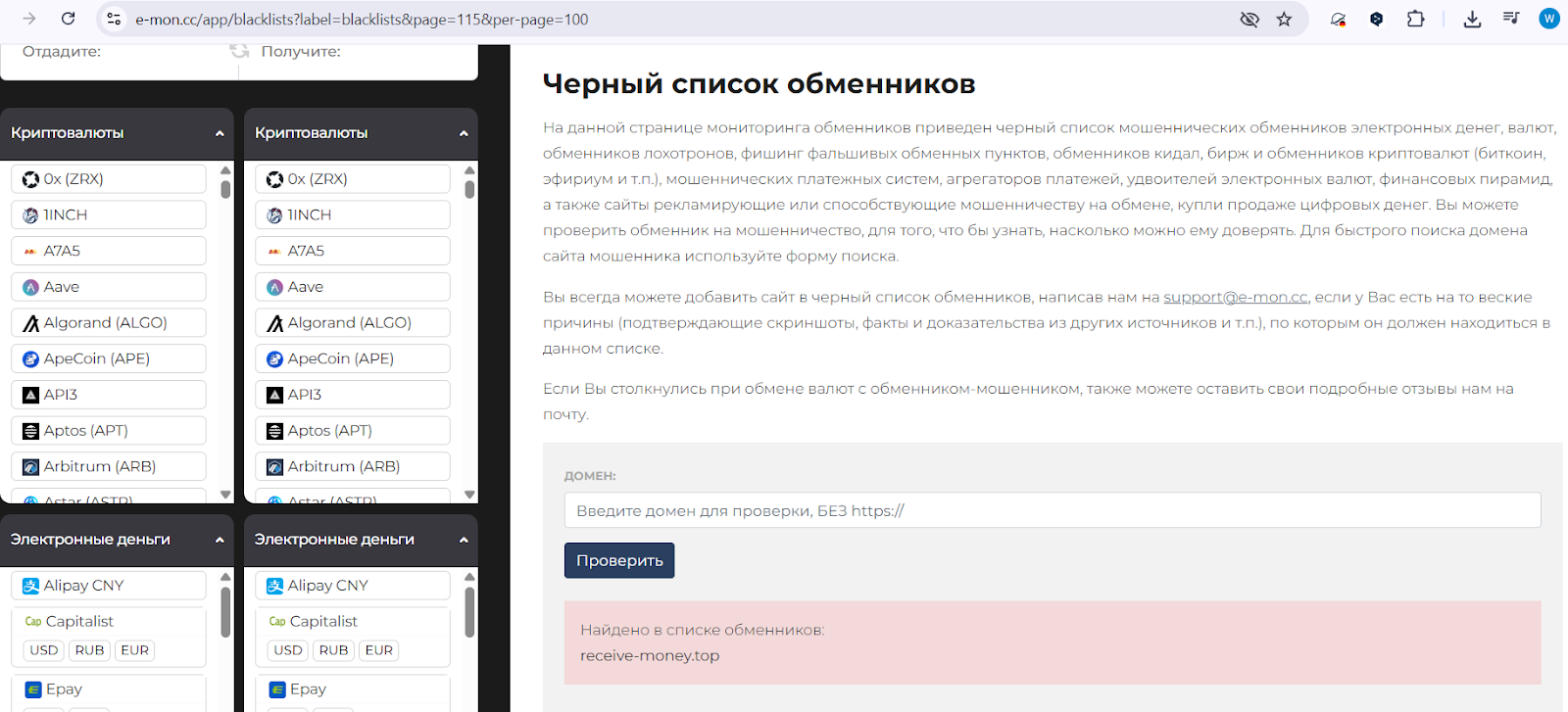 Ресурс занесен в черные списки криптообменников сразу на нескольких тематических сайтах, таких как e mon cc (страница 115, как фейковый обменник крипты), vklader com (раздел scam-ресурсов).