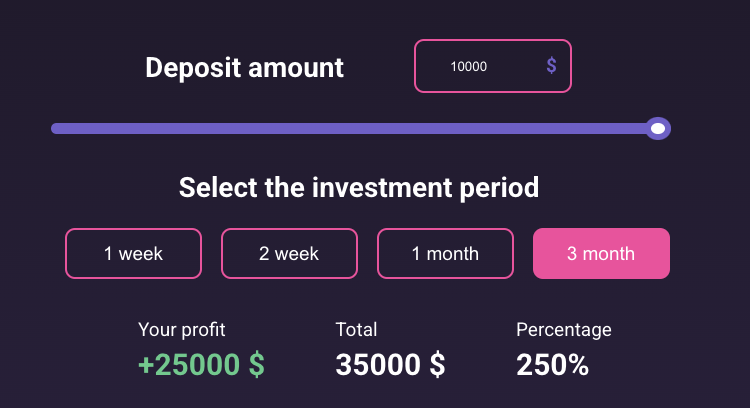 На сайте площадки привлекают спамом в соцсетях, по электронной почте и т.д. Пользователям предлагают возможность быстрого заработка на крипте за счет разных инструментов. Например, так выглядят инвестиции с доходностью 250% за 3 месяца: