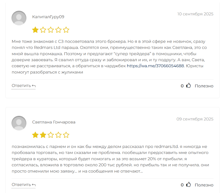 По открытым отзывам о «Про трейдинг редмарс лтд» картина в целом негативная. Чаще всего жалуются на вывод денег. Заявки тянут без объяснений, всплывают дополнительные комиссии, которых не было в условиях при регистрации. Регулярно упоминают блокировки счетов без предупреждения, особенно после прибыльных сделок или при попытке снять крупную сумму. Есть претензии к котировкам в моменты важных новостей. Пользователи пишут, что спреды «разъезжаются», сделки закрываются принудительно и в минус. Поддержка, по словам клиентов, либо молчит, либо отвечает шаблонно. В спорных ситуациях с выводом помощи добиться сложно. Встречаются истории о полной потере депозита после работы с брокером. Это самый тревожный сигнал.