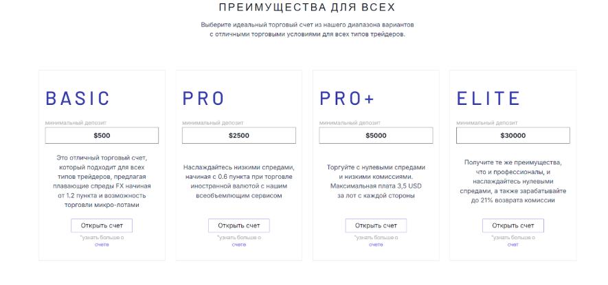 Счета разделены на четыре типа. Basic от $500, спреды «от 1.2 пункта», плечо 1:200. Pro от $2500, «от 0.6 пункта», плечо 1:300. Pro+ от $5000, нулевые спреды, комиссия $3,5 за лот и плечо 1:1000. Elite от $30 000, нулевые спреды, возврат части комиссий до 21% и плечо 1:1000. Пополнение обещают с банковских карт и в крипте. Есть обучающие видео и PDF. В блоке безопасности – шифрование, двухфакторная проверка и «раздельное хранение средств» в Barclays и RBS. Подтверждающих ссылок и документов не дают.