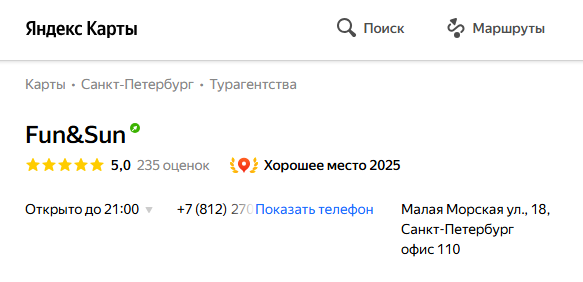 Яндекс.Карты подтверждают, что офисы действительно существуют и работают. В Санкт-Петербурге есть отделение компании на ул. Малая Морская. У него максимально возможный рейтинг, который сформирован из отзывов, оставленных довольными заказчиками.