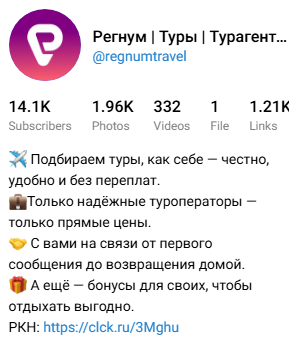 Рекламные менеджеры турагентства «Регнум Туры» ведут сообщество в Телеграм, созданное еще в 2021 году. «Стаж» в 4 года является солидным для такого ресурса. Это один из признаков компании, которой пользователь может доверять.
