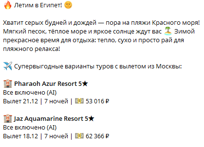 Следующий материал более подробно рассказывает о турах в Египет. Компания приводит точные цены: от 53 тыс. руб. за 7 дней. Открытое информирование о цене — признак честного продавца.