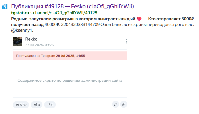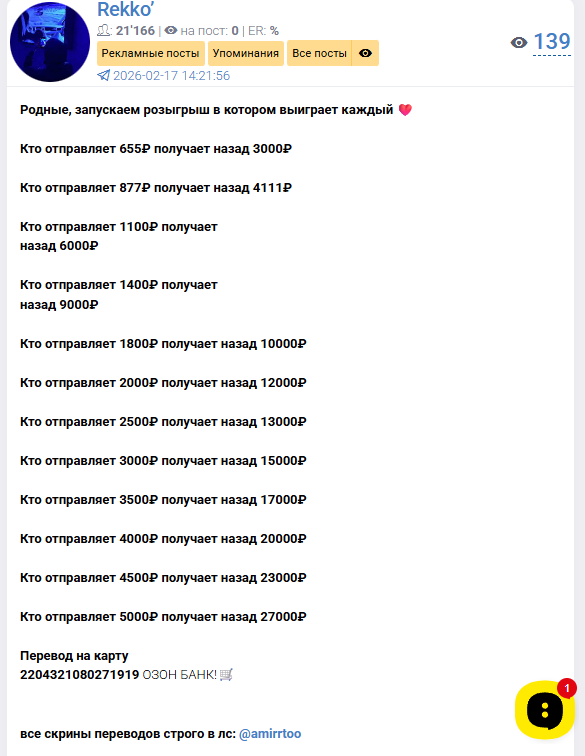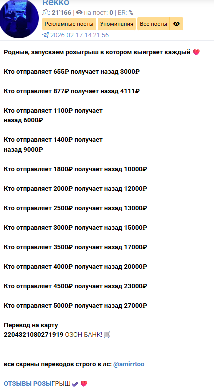 При этом у Тг-канала Rekko есть по меньшей мере один клон, который ведет некая Ксения. ТГСтат блокирует содержимое сообщества. Хотя канал полностью идентичный, на нем указан другой счет ОзонБанка. Это может указывать на то, что карты оформлены на подставных лиц – дроперов.
