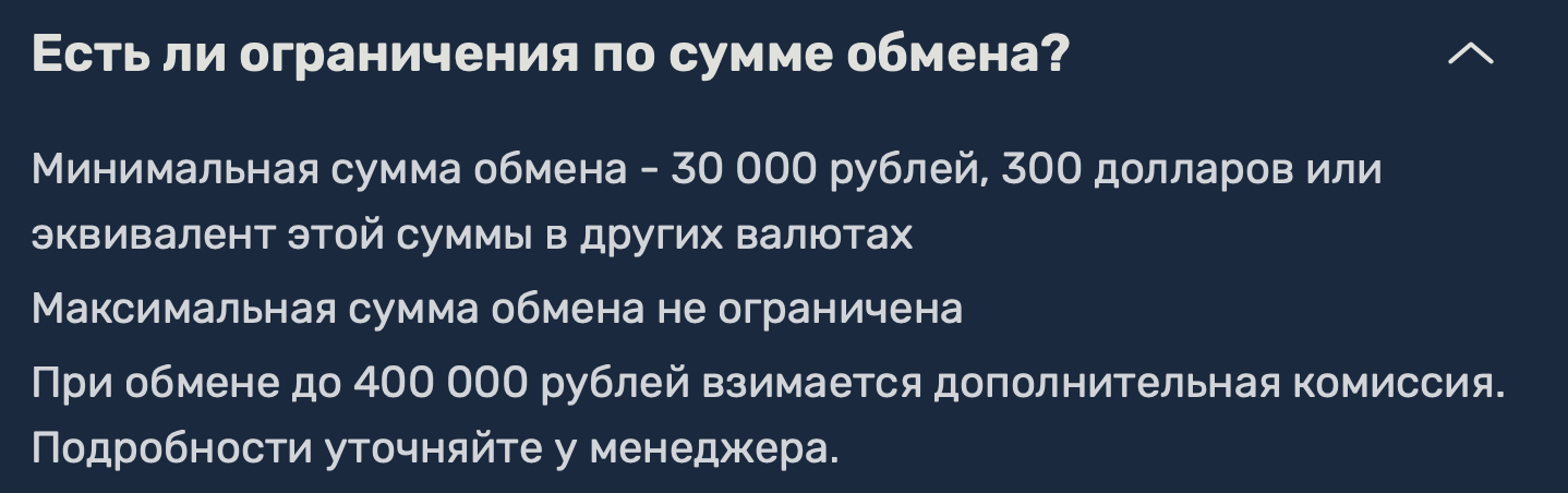 Столь размытый формат описания условий характерен для обменных сервисов «однодневок», которые не переживают о собственной репутации. Минимальная сумма обмена указывается, чтобы оградить сервис от множества мелких операций, а нежелание уточнять комиссии служит проверенным способом для заработка на пользователях.