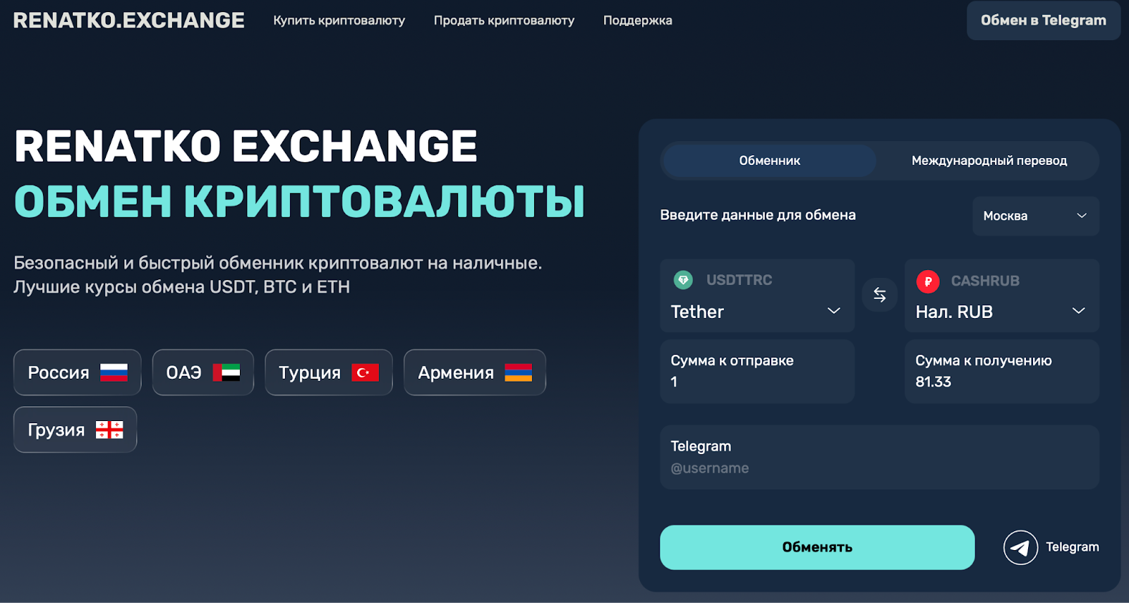 Онлайн-обменник «Ренатко Эксчейндж» разработан для того, чтобы пользователь мог быстро и выгодно конвертировать цифровые активы. На сайте сервиса заявлено, что он поддерживает безопасный обмен всех востребованных криптовалют, включая биткоин, Etherium и USDT.