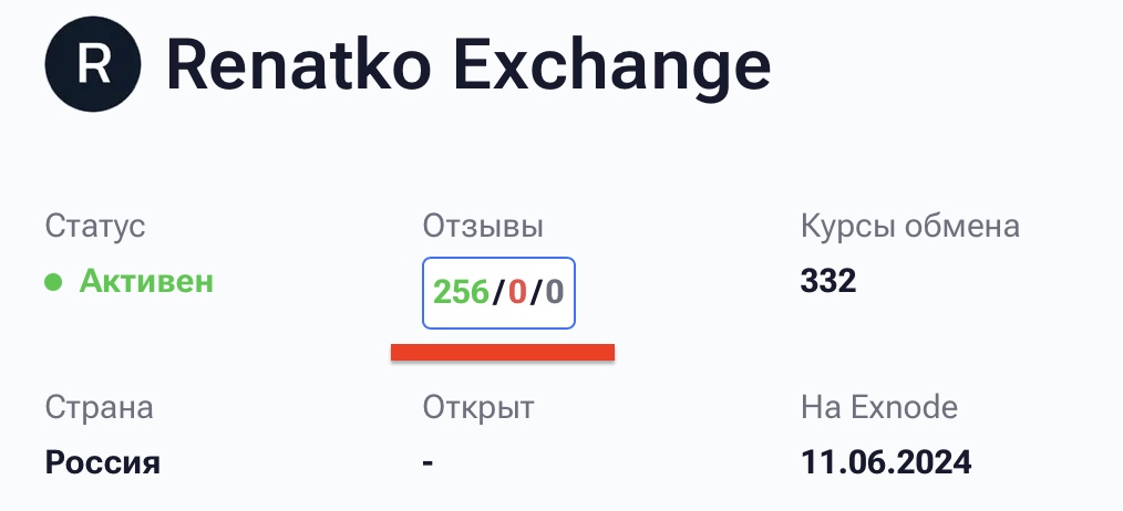 Что особенно смущает в случае с renatko exchange — отзывы, найденные нами на платформе Exnode. Кстати, на сайте обменника она заявлена как «официальный партнер». Как раз это объясняет нереалистичное соотношение отзывов: при 256 хвалебных комментариях нет ни одного негативного.