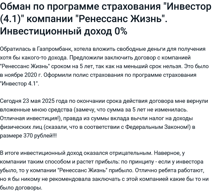Положительных отзывов по программе инвестиций от «Ренессанс Жизнь» в интернете не было.