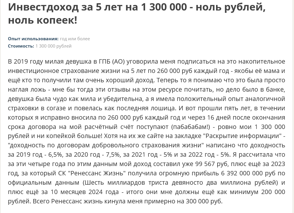 Неизвестно, были на сайте страховщика отклики клиентов, а на сторонних платформах есть только отрицательные отзывы по программе инвестиций от «Ренессанс Жизнь». Люди отмечали, что заключали договор по совету других лиц. Нужно было ежегодно вносить ₽260,000 в течение пяти лет. Когда договор закончился, клиент получил столько, сколько внес за этот период. В договоре была указана доходность в процентах, но клиенту ее не выплатили. Человек считал, что компания должна ему осталась примерно ₽300,000.