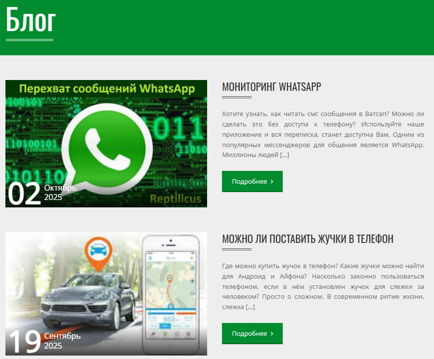 Зачем на площадке нужна вкладка “Блог” – неясно. Материалы здесь посвящены например тому, можно ли поставить в телефон жучки или нет. Последняя же статья выходила почему-то еще в октябре 2025-го, хотя ранее что-то новое публиковалось минимум каждый месяц.