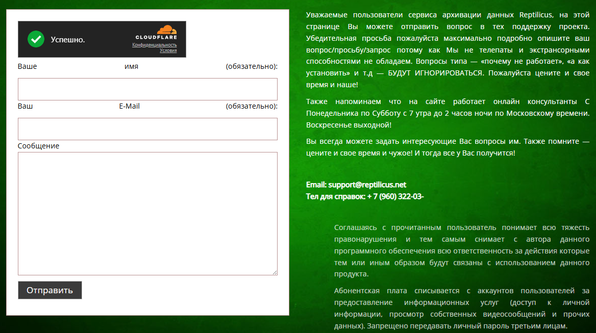 Для связи с разработчиками рекомендуется использовать форму на сайте, писать на почту, либо звонить по телефону. Вот только номер тут по неизвестным причинам неполный, в нем нет последних двух цифр.