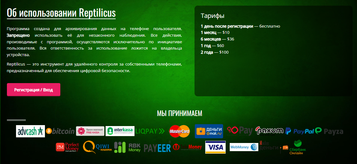 О том, что за использование программы нужно платить, сообщают только внизу страницы Reptilicus. Первый день все должно работать бесплатно, однако далее придется внести от 10 долларов за месяц.