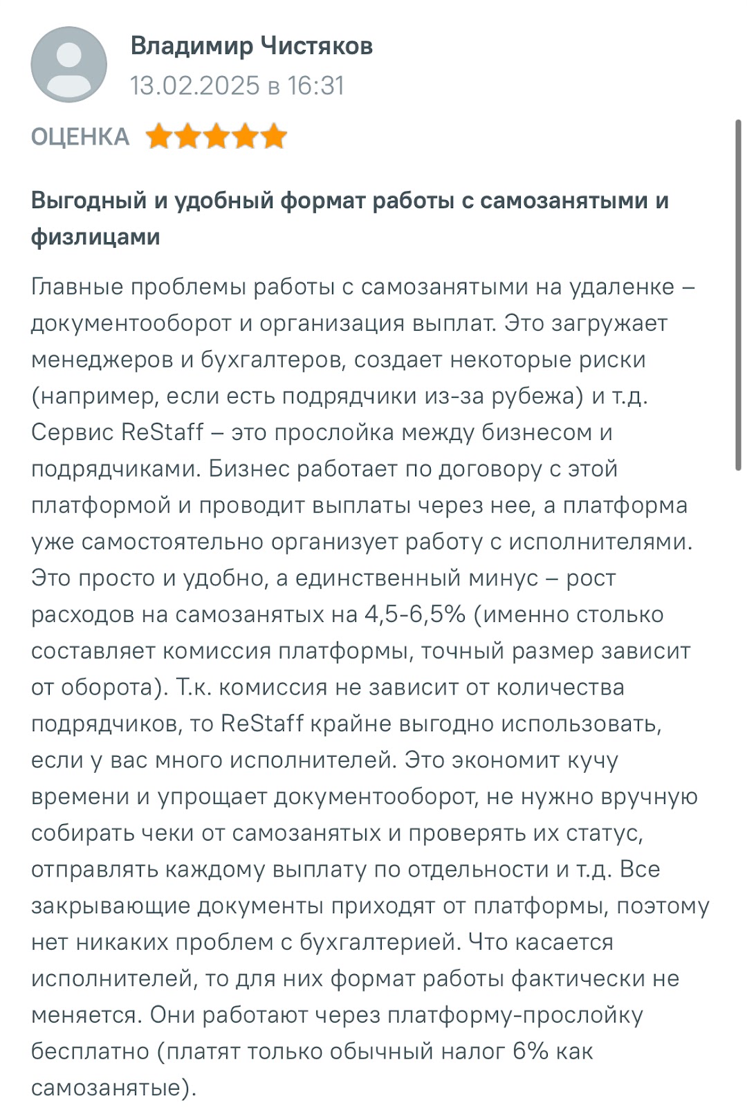 Restaff — отзывы о платформе положительные. Это российская HRTech-площадка для работы с самозанятыми и физлицами. Компания занимается помощью в сотрудничестве разным фирмам с фрилансерами, ИП или агентами. Партнерство распространяется также для международных организаций. Выплаты осуществляются по всему миру, не только в пределах РФ.