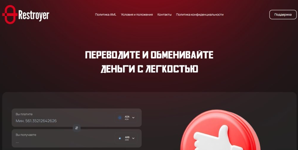 Restroyer – это обменник криптовалюты, предлагающий пользователям переводить токены и совершать разные базовые операции. Проект перестал работать и недоступен в январе 2026 года, но его судьба до конца неизвестна и в будущем компания может возобновить деятельность.