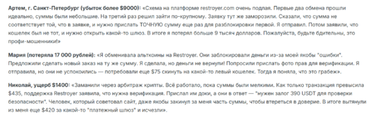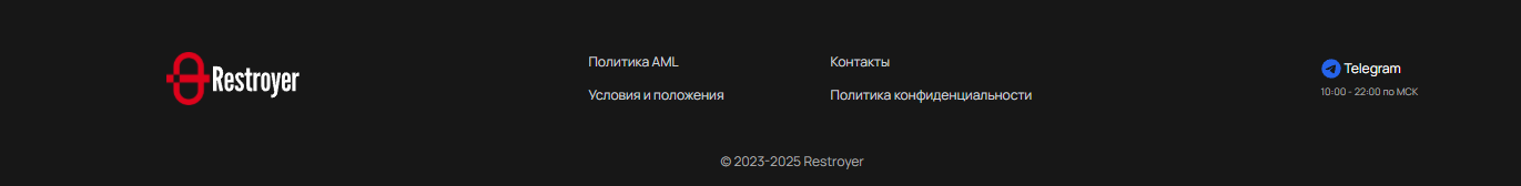 В подвале сайта было указано, что компания существовала с 2023 года, но эта информация оказалась ложной, а реквизитов юридического лица не было предоставлено. Вероятно, обменник Restroyer com не был нигде зарегистрирован, что говорит о работе в «серой» зоне и отсутствии надзора за операциями.