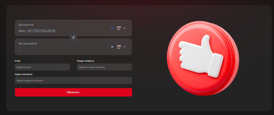Чтобы конвертировать токены, пользователю не нужно было регистрироваться или проходить дополнительную проверку. Достаточно было выбрать активы в форме на главной странице, а затем отправить заявку и оплатить ее по указанным реквизитам.