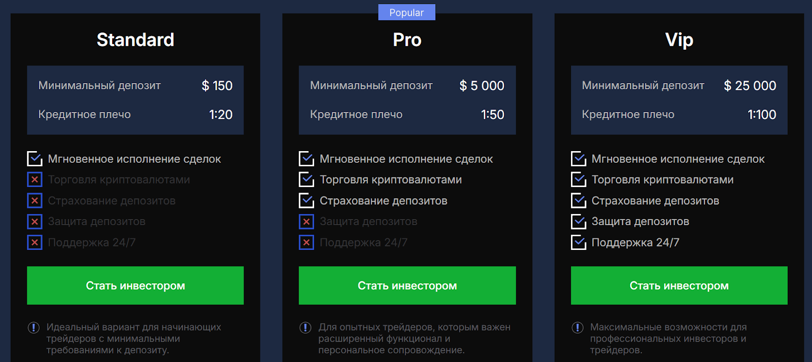 - Pro – депозит здесь начинается от 5 тысяч долларов, что открывает уже кредитное плечо 1:50, возможность торговать криптовалютами и страхование вкладов;