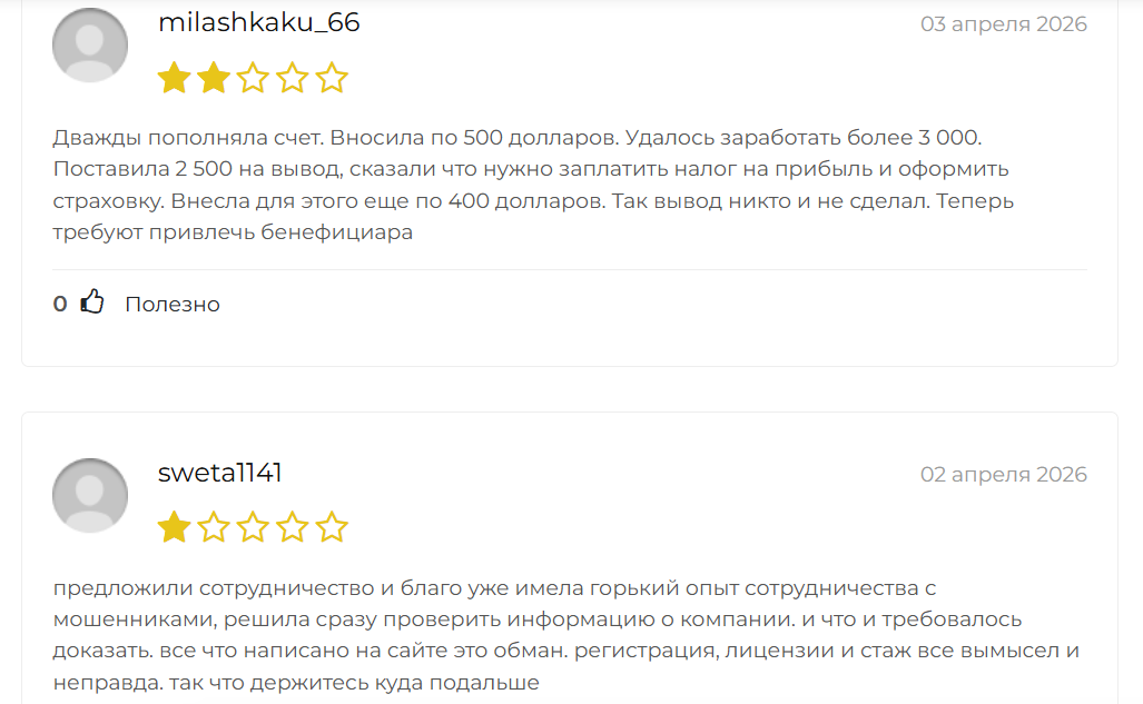 утверждает, что работает на финансовых рынках более 6 лет, но домен зарегистрирован всего 53 дня назад. Отсутствие лицензий и негативные отзывы клиентов, сообщающих о проблемах с выводом средств и навязывании дополнительных платежей, вызывают серьёзные сомнения в надёжности этой платформы.