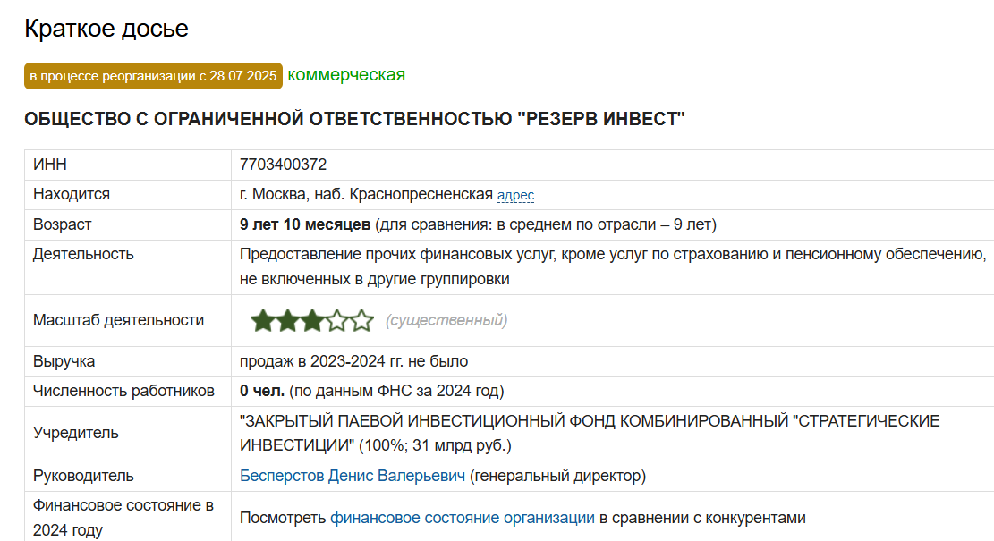 На портале Audit-It ru написано, что организация ведет существенный масштаб деятельности, но это понятно, ведь расчетная стоимость активов компании доходит аж до ₽31,000,000,000, хотя указан возраст около 10 лет, да и вообще процесс реорганизации идет с июля 2025 года.