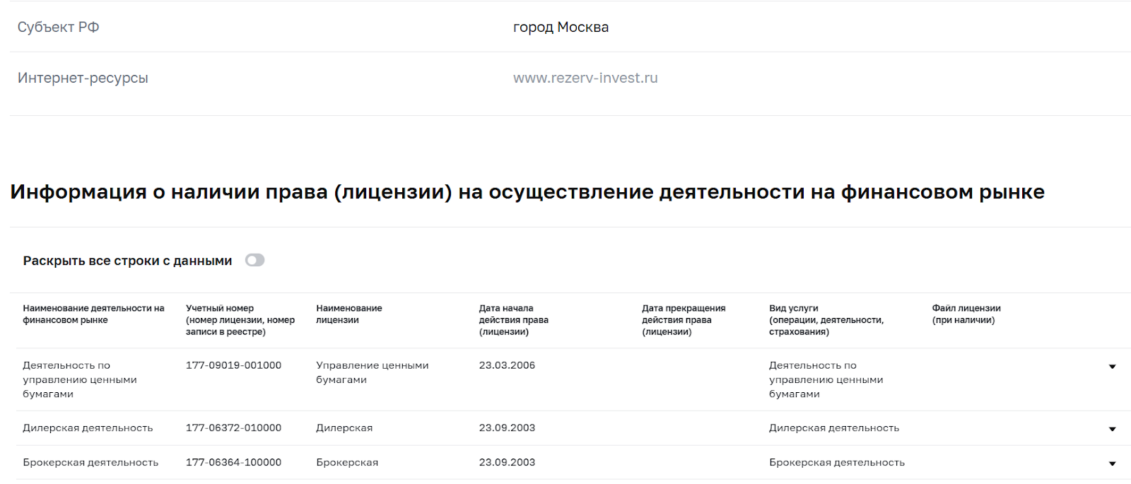 Помимо официальной регистрации «Резерв Инвест», у компании есть все необходимые лицензии на управление ценными бумагами, а также осуществление дилерской и брокерской деятельности, что легко проверить на сайте ЦБ РФ.