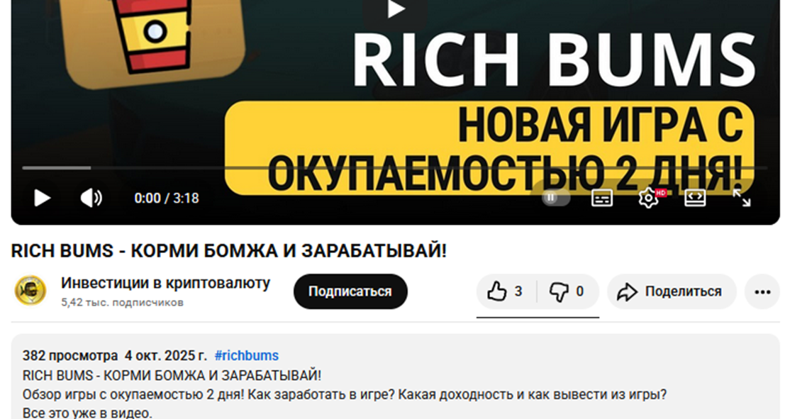 В сети не удалось найти отзывов игроков о мини-приложении RichBums. Есть только видео обзор на Ютуб, где блогер приводит пошаговый процесс заработка. Он заявляет о быстрой окупаемости проекта, но ничего не говорит о том, можно ли получить свои деньги. Комментариев к обзору нет, количество просмотров и лайков – минимальное.