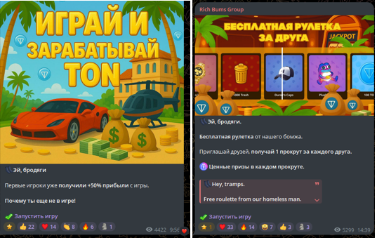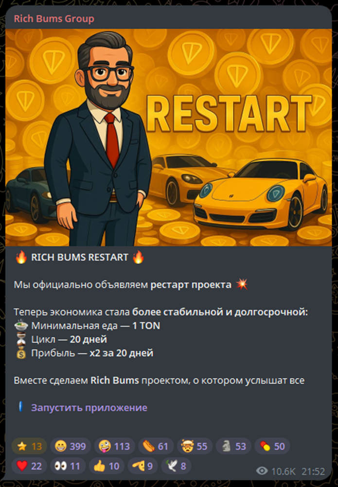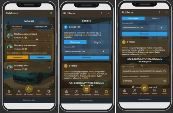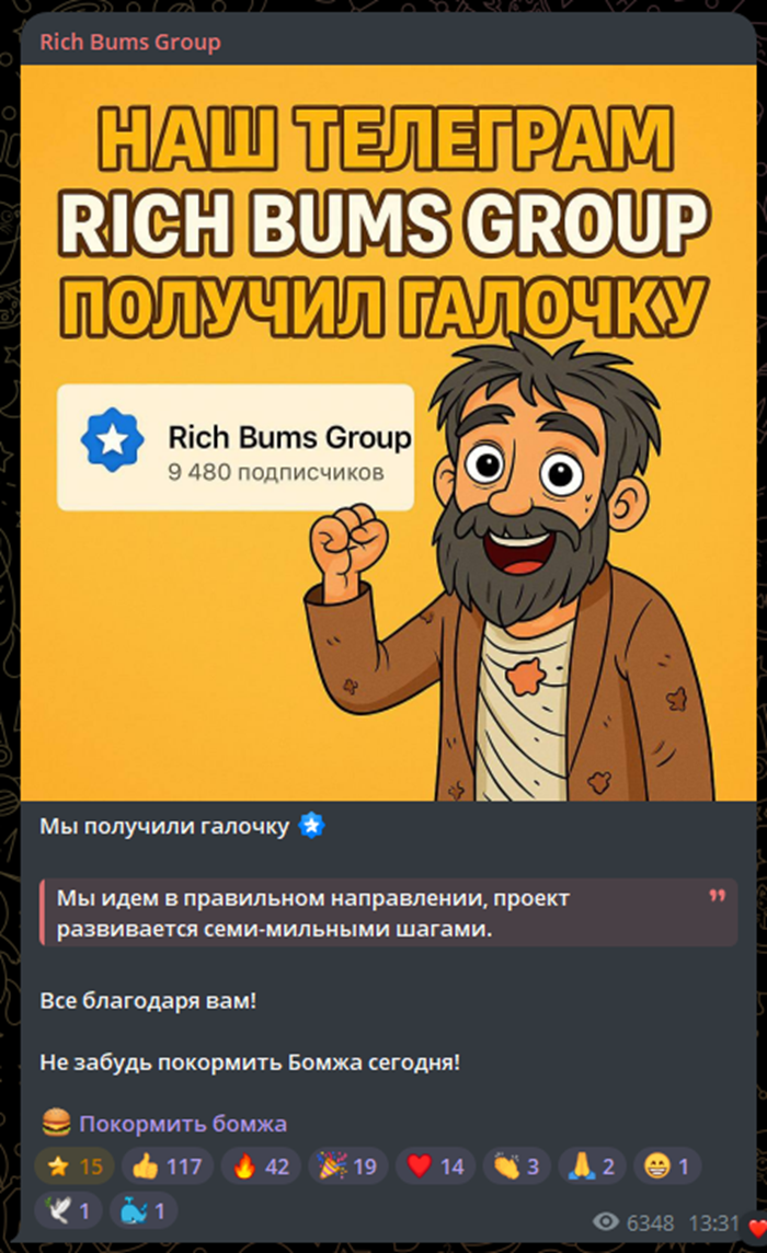 Rich Bums Group – проект в Телеграмм, предлагающий игрового бота с возможностью реального заработка крипты. Канал начал работу в апреле 2025 года, но приложение Богатый Бомж стартовало только в начале сентября.