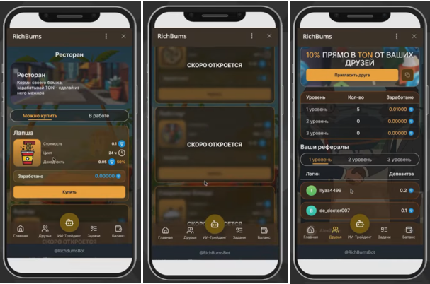 Rich Bums Bot — очередная пустышка, обещающая золотые горы, а на деле — пустые карманы. Обещания дохода до 5% в день — явный признак финансовой пирамиды. Не ведитесь на этот развод!