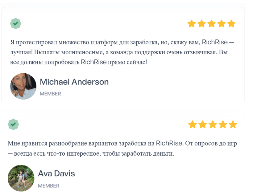 Отзывы о заработке с Rich Rise в сети немногочисленные. При этом они выглядят как заказные. Вот несколько примеров: