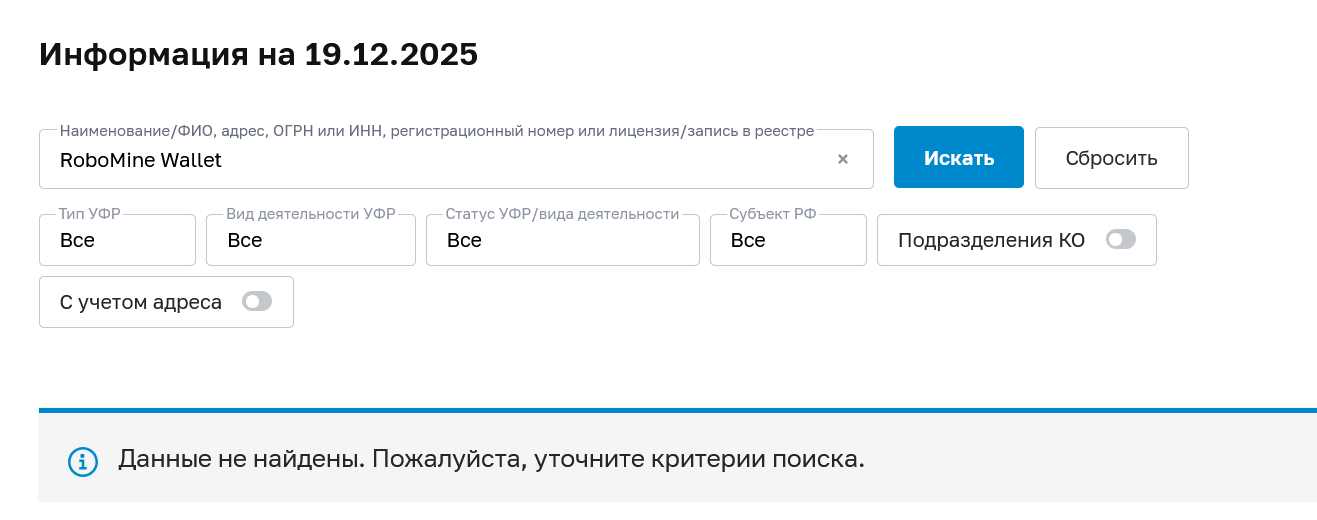 Разрешения российского ведомства на работу с криптовалютой у платформы RoboMine Wallet не было.