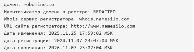 Неизвестно, кто выступал в роли создателей площадки, какая это была компания, где имела регистрацию и когда была образована. Домен по адресу robomine io, как удалось выяснить в ходе проверки, был создан в ноябре 2024 года, а через год обновлен.