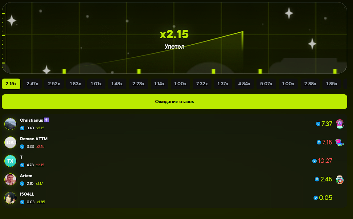 Бот открывается через стандартное меню Телеграма. На главном экране – график полета ракеты с текущим множителем. График показывает траекторию в реальном времени. Снизу расположен список активных ставок других игроков с их никами и суммами.