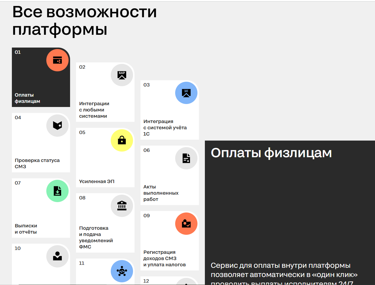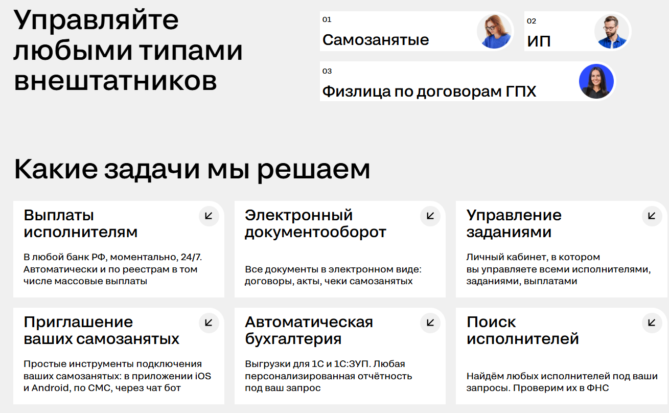 Кроме того, сервис помогает компаниям вести документооборот. Есть функционал для учета налоговых обязательств при работе с самозанятыми.