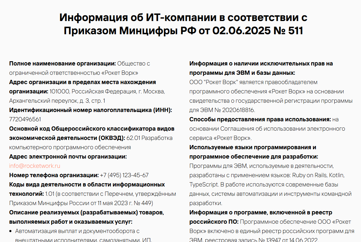 Для связи с компанией на сайте указаны электронные адреса help rocketwork ru и partner rocketwork ru. На них можно отправить запрос на консультацию или подключение сервиса.