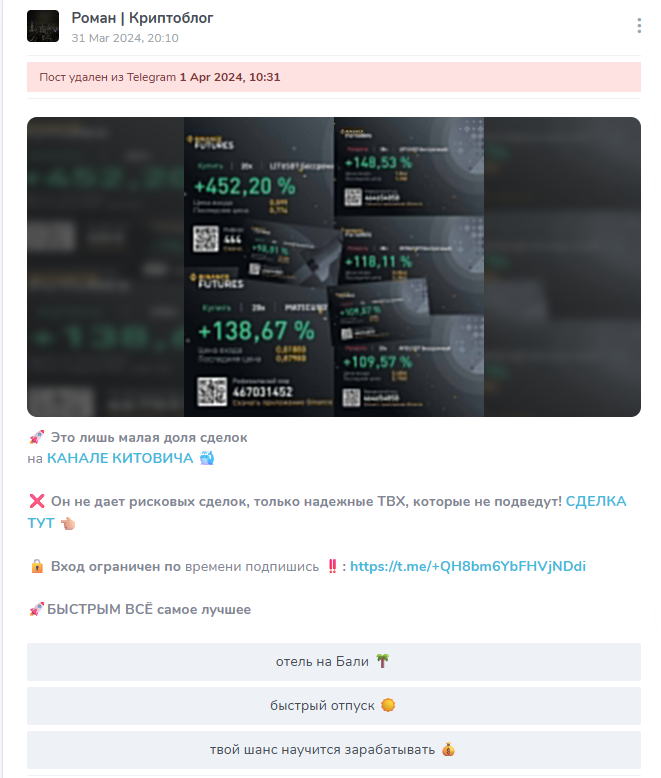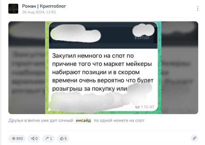 Заметим, что иногда Роман пытается предоставить сигналы на инсайды. Это может быть весьма высоким фактором риска, так как под видом инсайдов в крипте нередко дают сигналы на покупку скам-токенов.